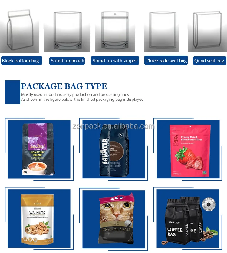 Funksjon: Mini-doypack-maskinene kan automatisk fullføre veiing av frysetørket frukt, nøtter, snacks, potetgull, frossenmat, kaffebønner, kjæledyrfôr, tørrfôr til hund, kattefôr, jerky, kjøttpinner, popcorn, kjeks, korn, diverse korn, harde godterier, gummies, sjokolade, bønner og andre produkter, samt fylling, pakking og forsegling av doypack-poser. Pakkeposer Type: Flat pose, stående pose, stående pose med glidelås, firedoblet pose, doypack-pose, glidelåspose, osv.For andre typer pakkeposer, vennligst kontakt kundeservice for konsultasjonValgfri enhet: Bøtteheistransportør, flerhodevekter, skruefyller, skruetransportør, matkontrollvekter, metalldetektor for mat, transportbånd, arbeidsplattformer for støtte av flerhodevekter osv.